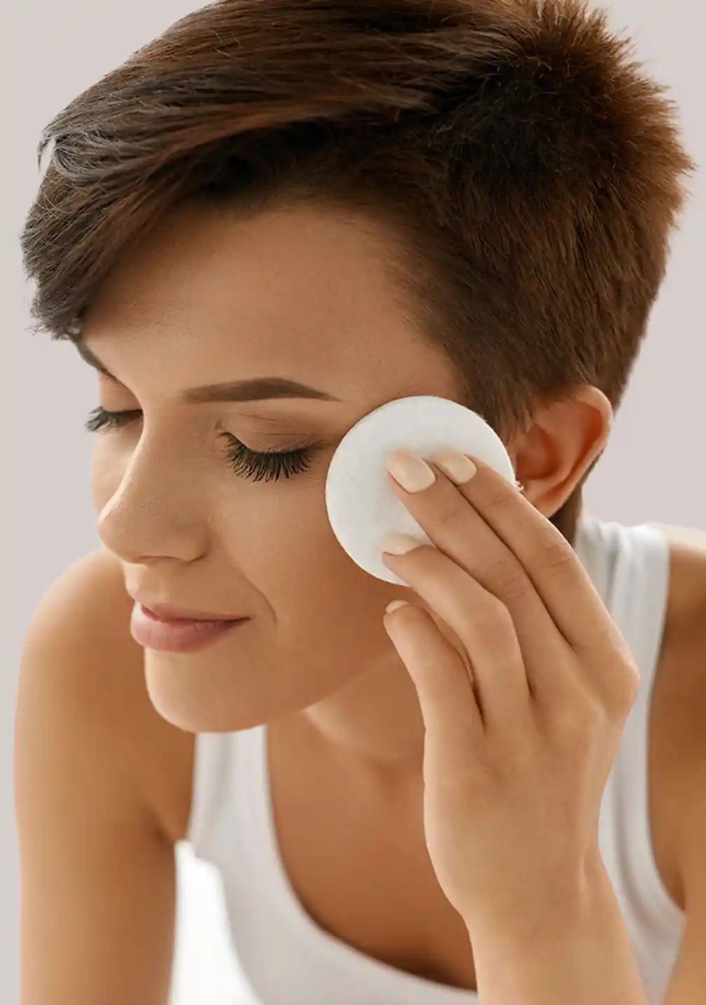 洁面后,用化妆棉蘸取爽肤水,彻底擦拭面部、颈部和肩部。